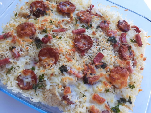 Coloque o arroz num tabuleiro de forno, misture a carne, a salsa cortada e enfeite com chouriço e o bacon.