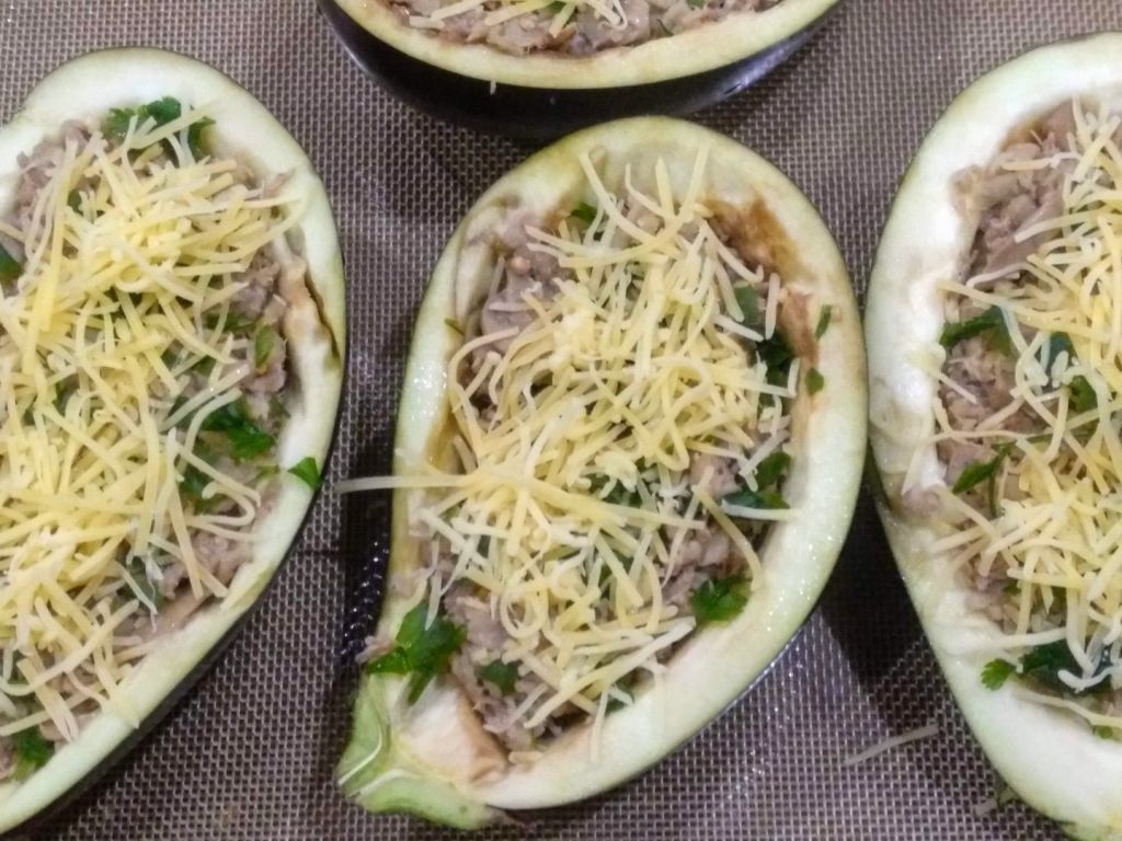 Recheie as beringelas com o refogado, polvilhe com salsa e queijo picado.