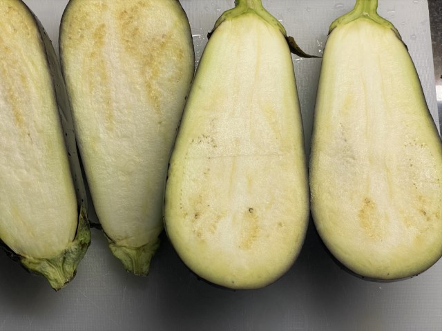 Corte as beringelas ao meio, no sentido do comprimento.