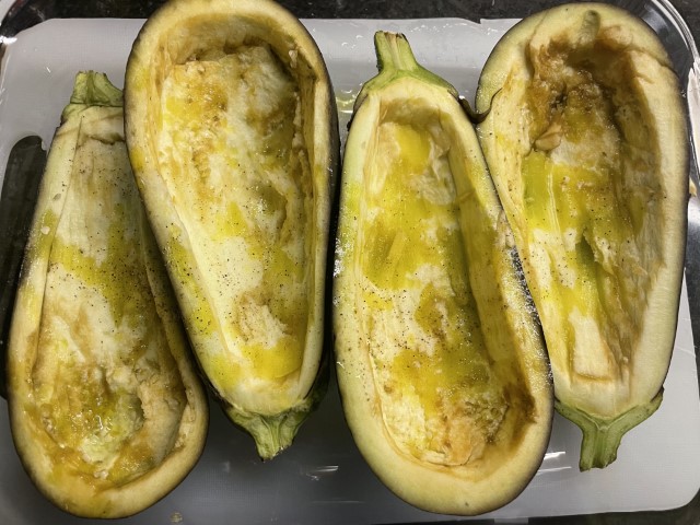 Regue as beringelas com um fio de azeite e leve ao forno pré-aquecido a 190ºC por 20 minutos.