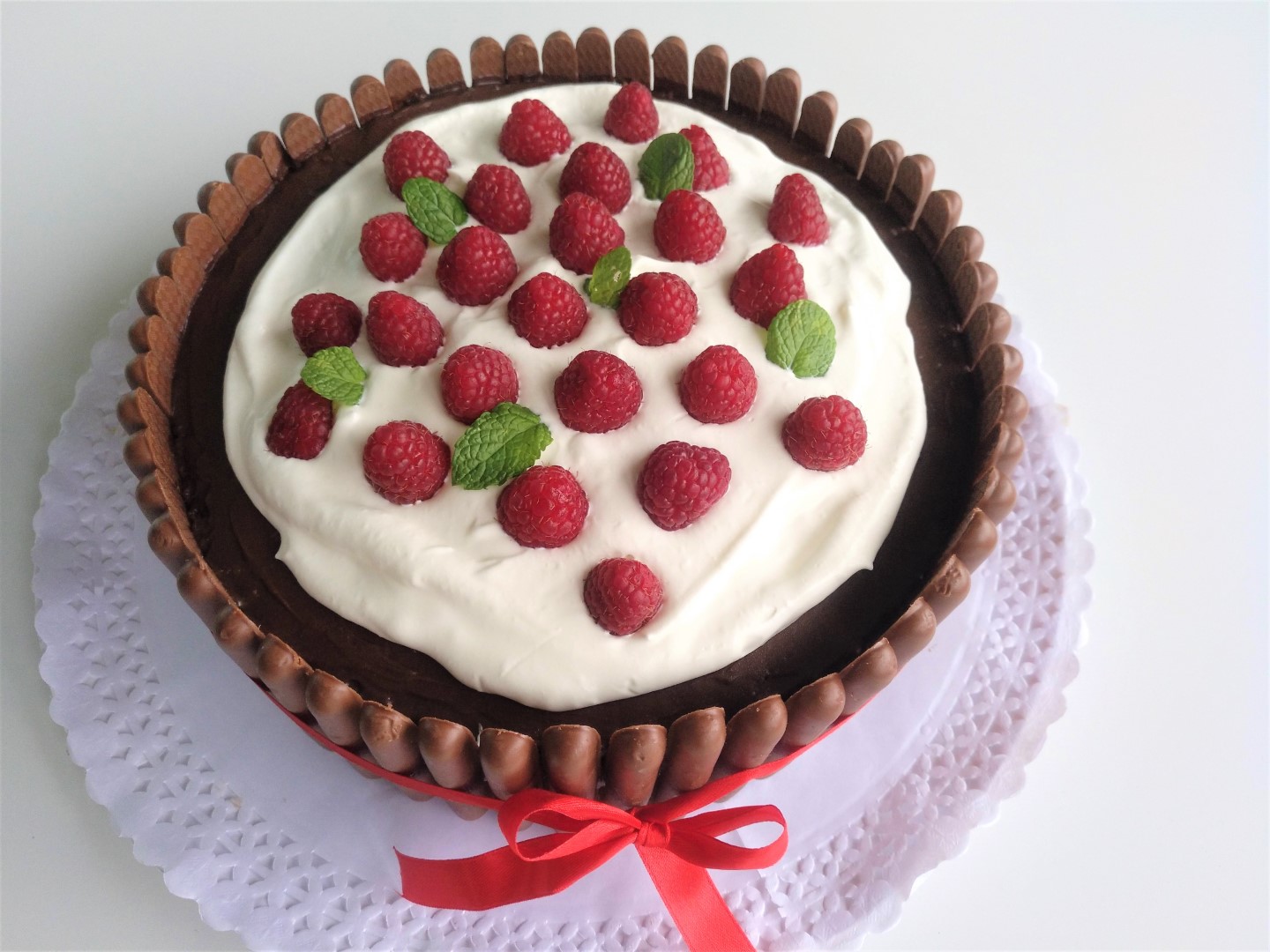 Usei uns palitos de chocolate para rodear o bolo e por cima decorei com natas batidas em chantily, framboesas e umas folhitas de hortelã, para dar vida ao bolo.