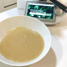 Adicione o iogurte, o leite, as maças e a pitada de sal e misture 30seg / vel.2.5.