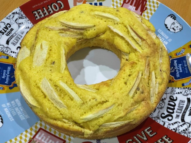 Deite o preparado na forma untada com manteiga e polvilhada com farinha, disponha as fatias de maçã e leve ao forno a 180°C cerca de 40 minutos.