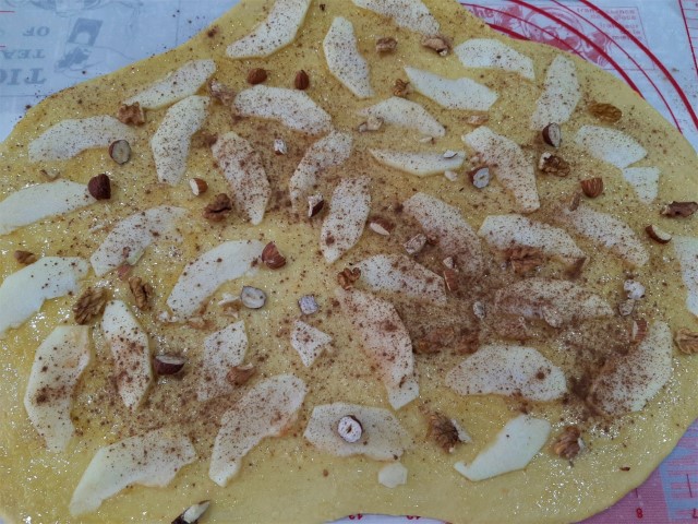 Distribua pela massa a maça cortada finamente e os frutos secos e polvilhe com canela.