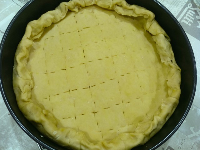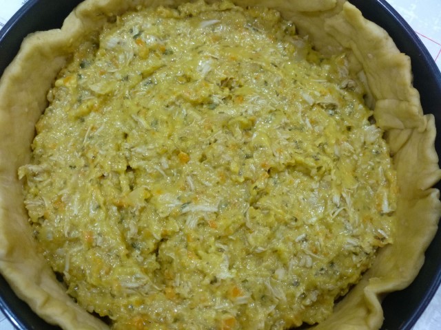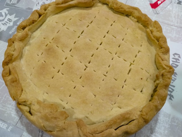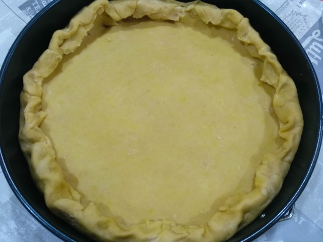 Numa superfície polvilhada com farinha, estenda finamente, com a ajuda de um rolo ⅔ da massa. Forre uma forma de fundo amovível (Ø 26 cm aprox.) e recheie. Cubra com a restante massa e una os bordos de baixo para cima. Decore a gosto com as sobras de massa, pincele com o ovo batido e faça um pequeno furo no centro para permitir a saída de vapor. Leve ao forno a 200°C cerca de 30 minutos.