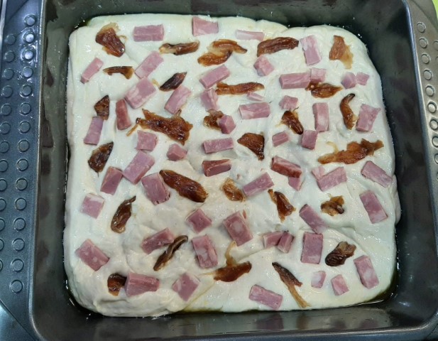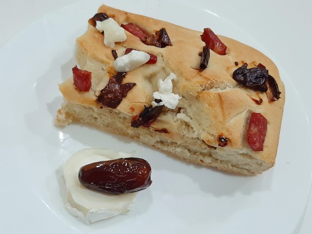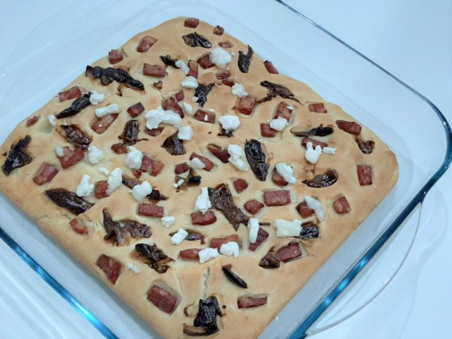 Focaccia com tâmaras, bacon e queijo de cabra