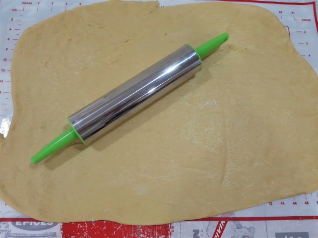 Numa superfície polvilhada com farinha, estenda a massa em forma de rectângulo e cubra com metade dos enchidos.