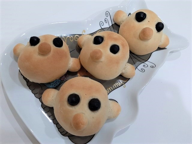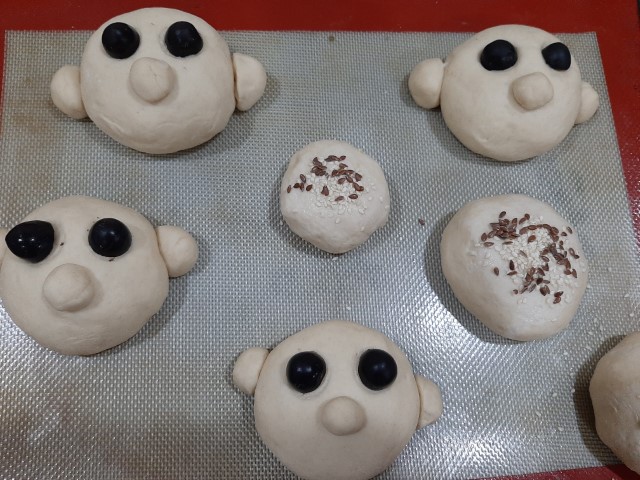 Para as orelhas, faça bolas e coloque nas laterais de cada bola. Decore com as azeitonas para fazer os olhos e uma bola de massa para formar o nariz.