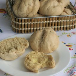 Deixe o pão arrefecer um pouco, corte-o ao meio, tendo cuidado para não soltar as orelhas.