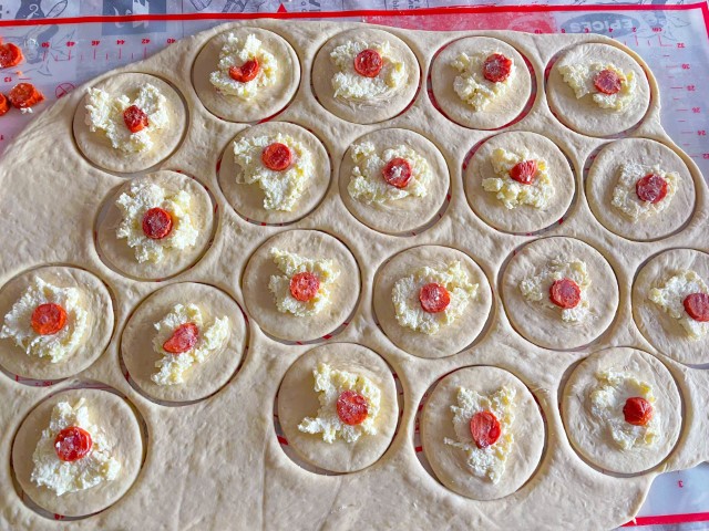 Coloque no centro de cada círculo uma 1 c. de chá da mistura de queijo e uma rodela de linguiça.