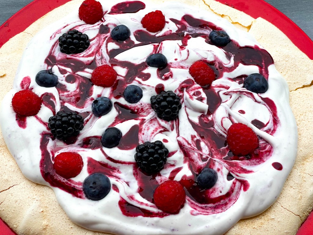 Cubra a pavlova com colheradas do chantilly com framboesa, guarneça com os frutos vermelhos e sirva de seguida.