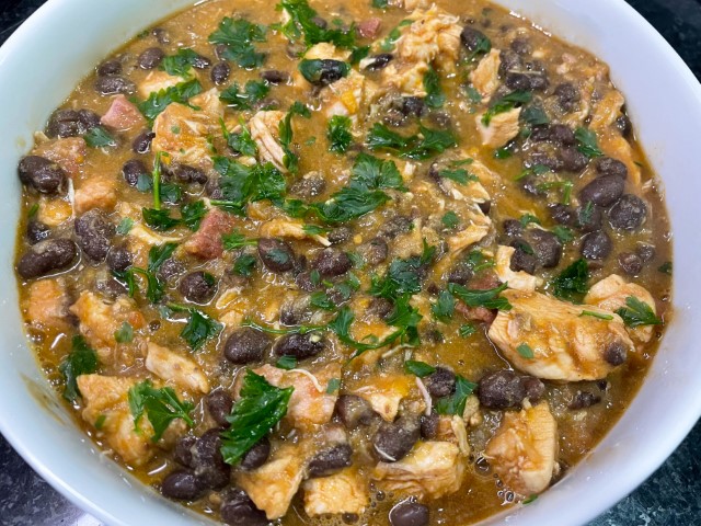 Adicione o feijão-preto e cozinhe 2 min/120°C/vel colher inversa. Polvilhe com os coentros picados e sirva com puré ou arroz branco.