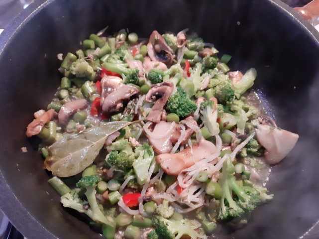 Pincele com azeite um wok e salteie por 10 minutos o alho picado, a cebola, o louro, os brócolos divididos em ramos e os próprios caules caules cortados às tiras, os espargos cortados aos cubos, cogumelos e pimento vermelho.