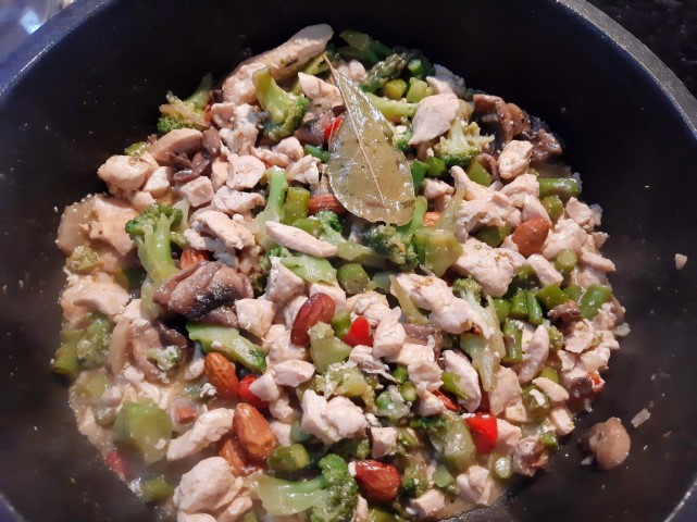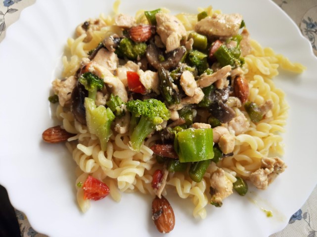 Adicione os legumes reservados e as amêndoas e salteie por mais uns minutos.