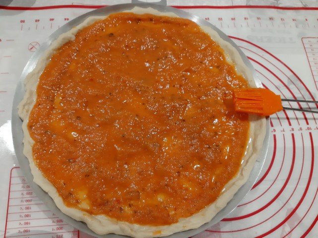 Cubra a massa com o molho de tomate e 1/3 do queijo mozzarella ralado.