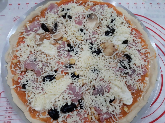 Disponha os restantes ingredientes a gosto e cubra com o restante queijo mozzarella.