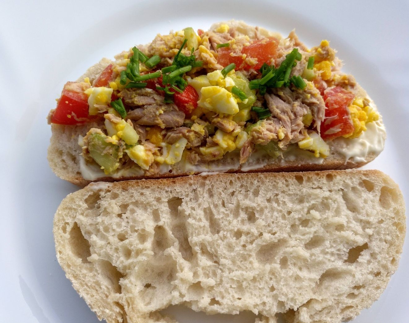 Barre 1 fatia de pão com maionese, guarneça com 2 c. de sopa da salada de atum, polvilhe com o cebolinho e cubra com outra fatia de pão. Repita até terminar o pão, a maionese, a salada e o cebolinho.